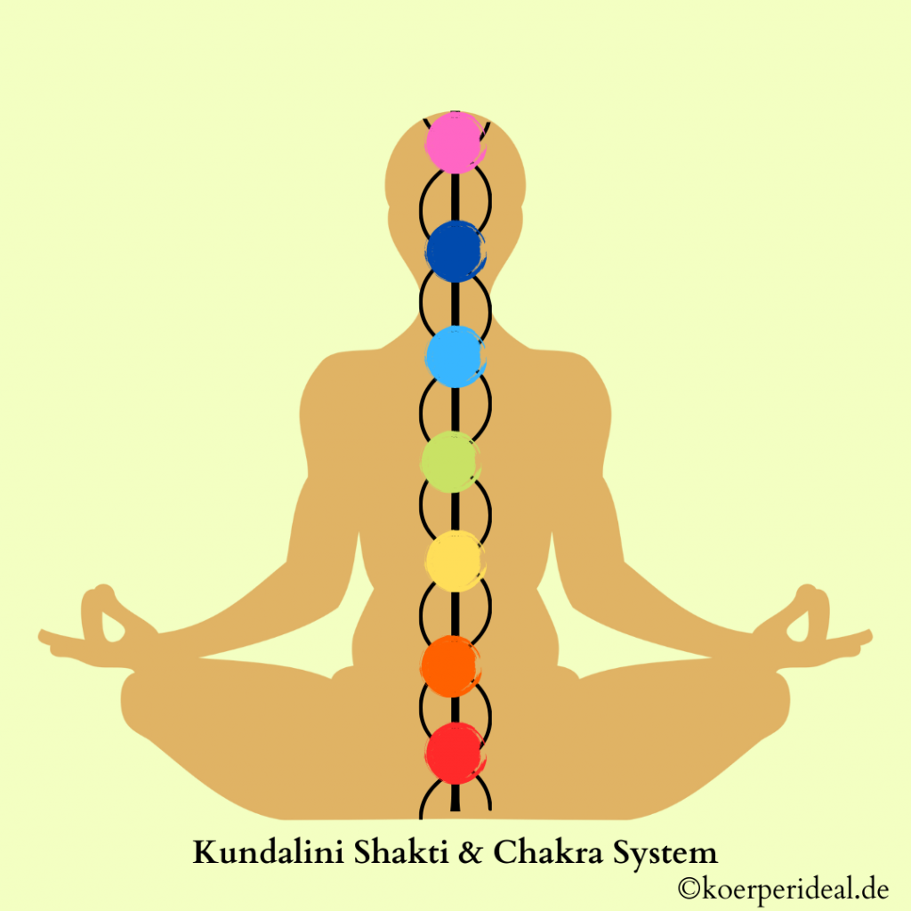 Die Verteilung dieser Lebensenergie geschieht nicht zufällig. In der yogischen Philosophie wird beschrieben, dass Prana durch feine Energiekanäle – die Nadis – fließt. Dort, wo sich viele Nadis kreuzen, entstehen Energiezentren, die wir als Chakren kennen. Sie sind wie Knotenpunkte, an denen Lebensenergie gesammelt, transformiert und weitergeleitet wird. Die rechte Abbildung stellt die Entstehung der Chakren dar: die mittlere Linie ist das Shushumna Nadi, links und rechts verlaufen gegensätzlich voneinander Ida und Pingala.